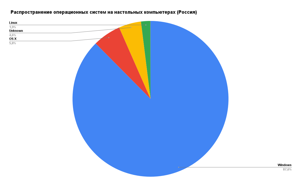 На десктопах абсолютный лидер — это Windows, что вполне ожидаемо.
