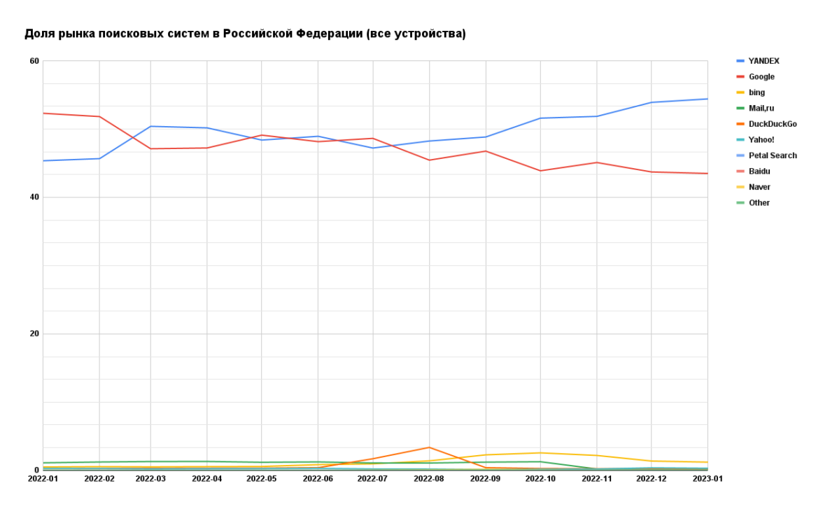 В марте 2022 года десктопная веб-версия Yandex обогнала по популярности Google и концу года выбилась в лидеры поисковых систем.