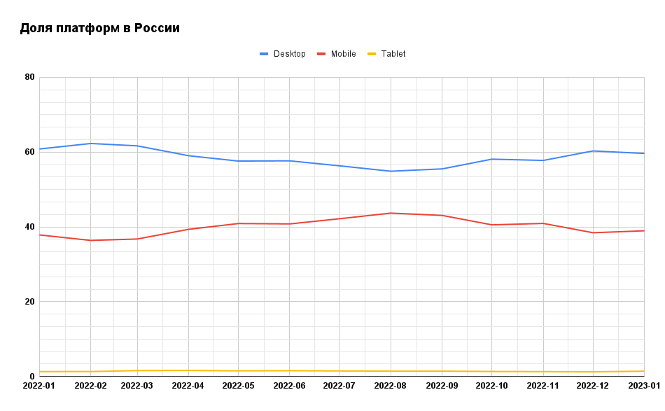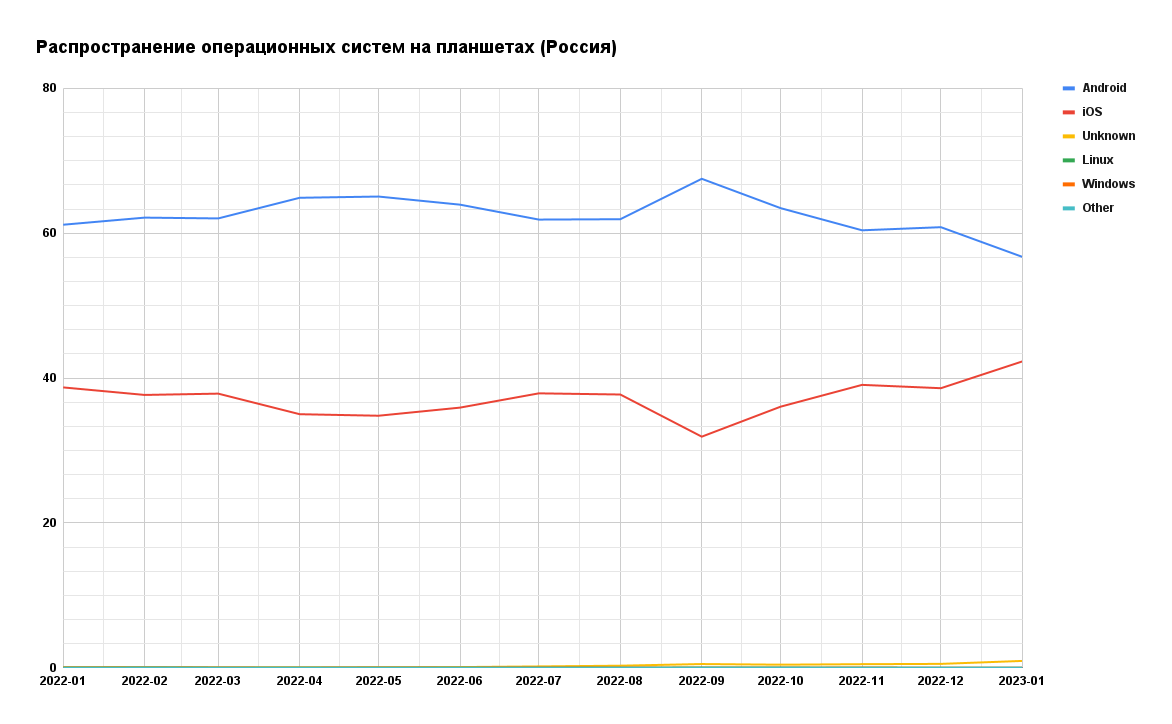 Windows также остается самой популярной операционной системой для ПК, как и Android для мобилок. Однако доля планшетов под управлением ОC Android в РФ по сравнению с миром значительно выше.