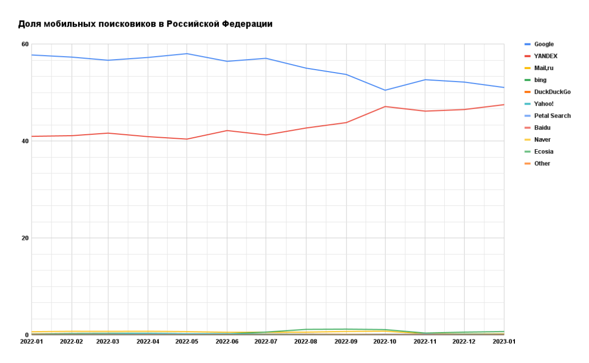 Как и следовало ожидать с огромным отрывом, на всех платформах первое место достается поисковику от Google. С огромным отставанием на втором месте расположился Bing. Интересно, как изменятся показатели Bing в феврале-марте 2023 года после внедрения в поисковик ChatGPT? Будем отслеживать эту статистику.