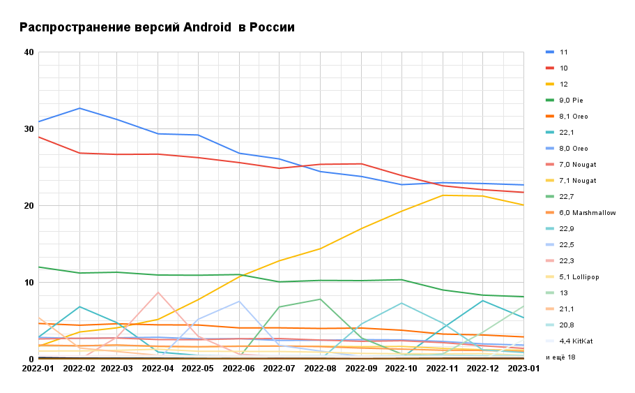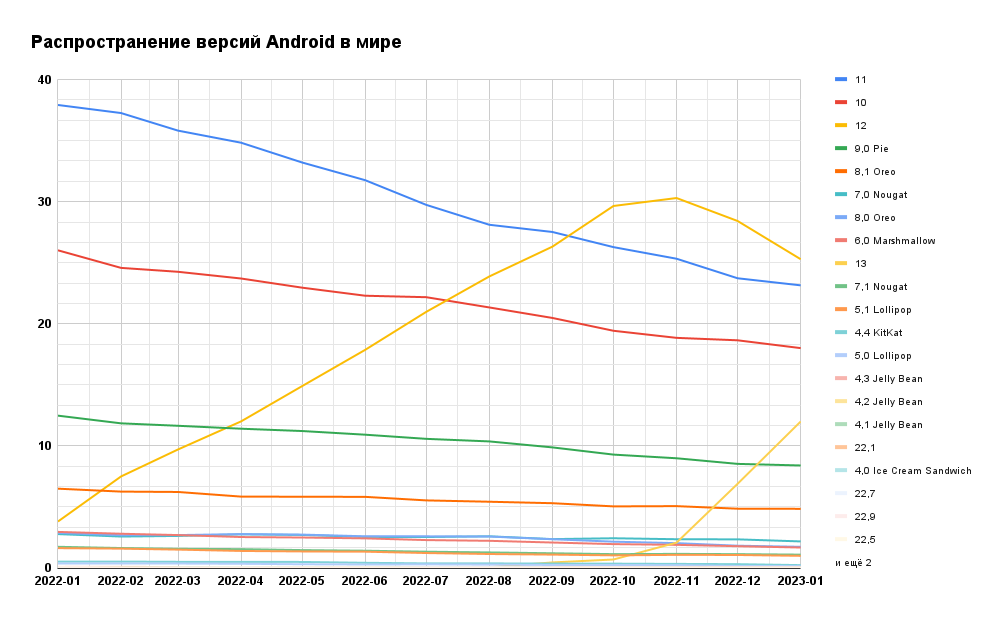 Среди версий Android в мире первые места занимают 12-ая,11-ая и 10-ая версии. Однако видно, что 13-ая версия начинает набирать популярность в первый месяц 2023 года.