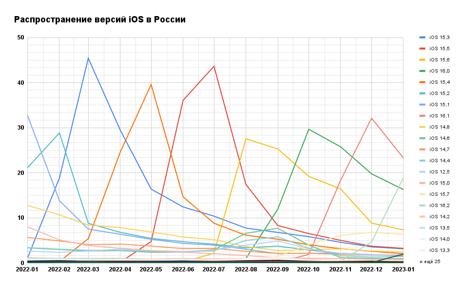 На графиках видно, что в мире наиболее распространены версии iOS 16.X В России ситуация примерно такая же.