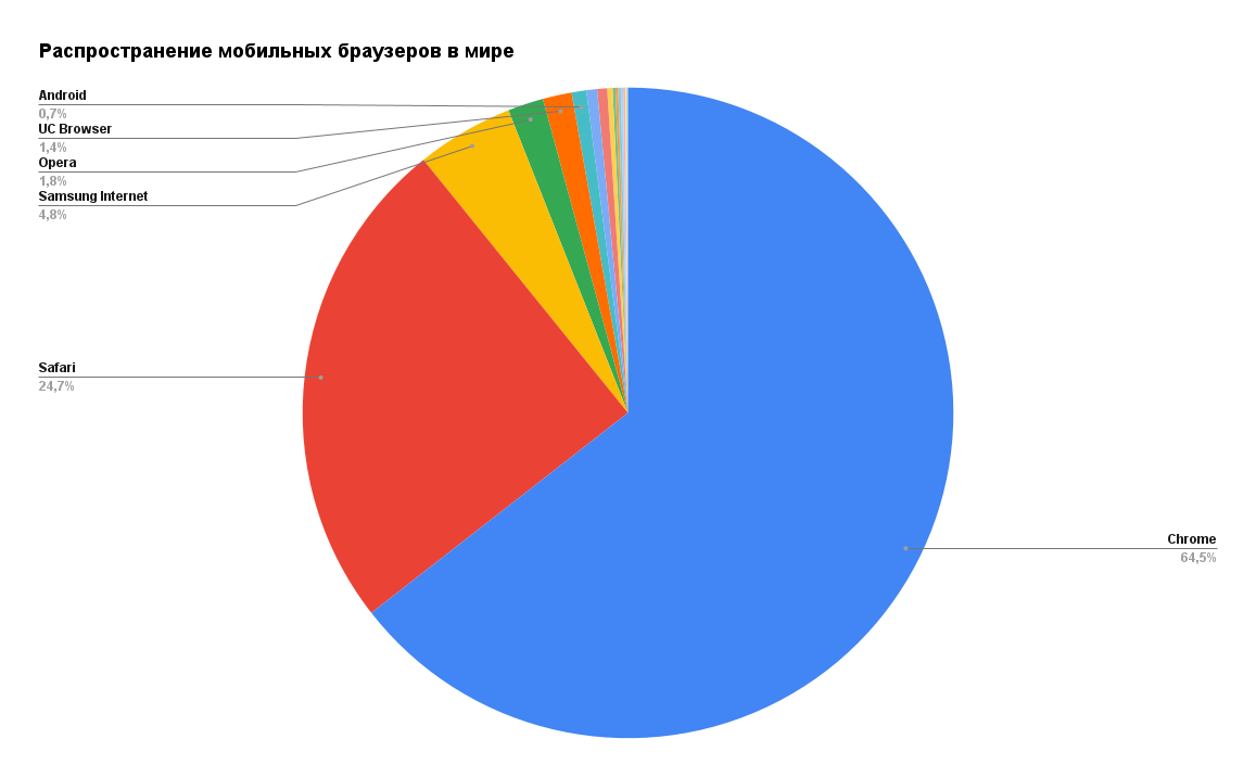 Безусловный мировой лидер среди браузеров — Google Chrome. Второе место занял Safari. Если посмотреть на распространенность мобильных браузеров в мире, то картина особо не изменится.