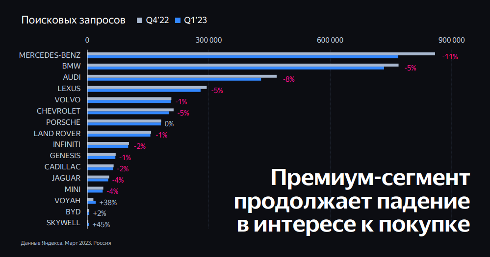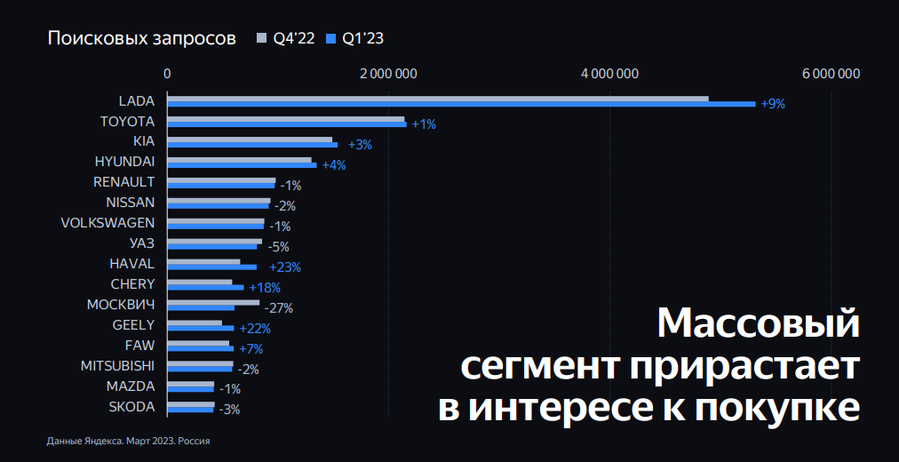 В целом, интерес к покупке автомобилей из-за границы снижается на 6% в 1 квартале 2023 года относительно 4 квартала 2022 года