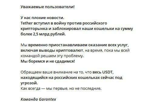 В результате все операции с USDT на Garantex были приостановлены, пользователи не могли ни вывести, ни перевести средства.