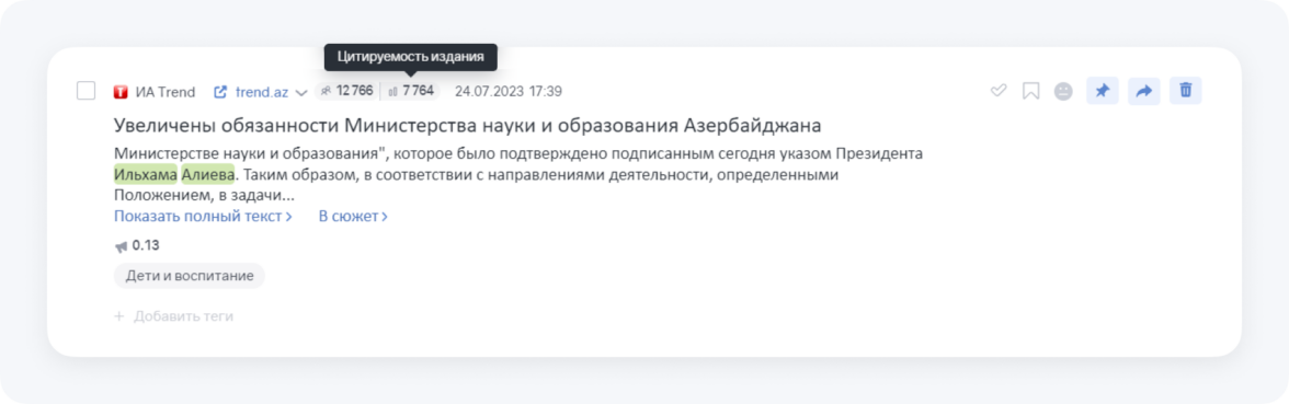 Для всех СМИ рассчитан и будет обновляться индекс цитируемости, который показывает влиятельность источника. Индекс цитируемости используется для медиапланирования коммуникаций и для оценки их эффективности с помощью расчета Медиаприсутствия объекта мониторинга.