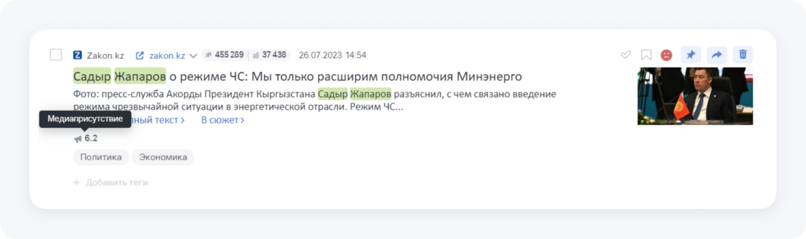 3. Доступен показатель Медиаприсутствия для оценки эффективности коммуникаций. Для каждой публикации в СМИ, а также для любого аналитического среза по СМИ автоматически рассчитывается показатель Медиаприсутствия, отражающий эффективность инициированных или иных публикаций.