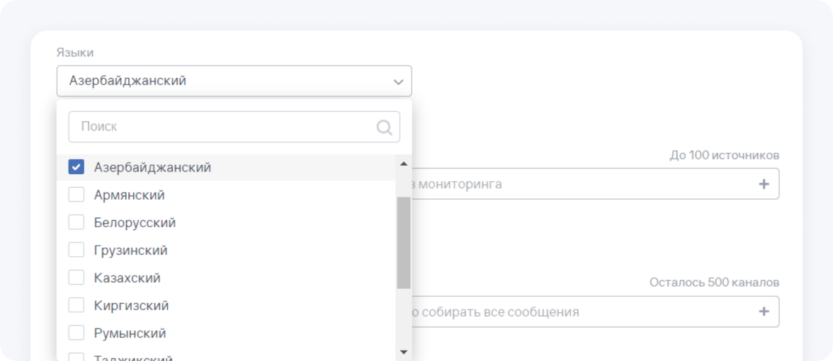 4. Во всех тарифах расширен список языков для мониторинга. При создании темы мониторинга вы можете теперь выбирать добавленные языки: Азербайджанский, Грузинский, Киргизский, Таджикский, Туркменский, Узбекский. Вы также сможете использовать данные языки при работе с фильтрами и аналитическими срезами.
