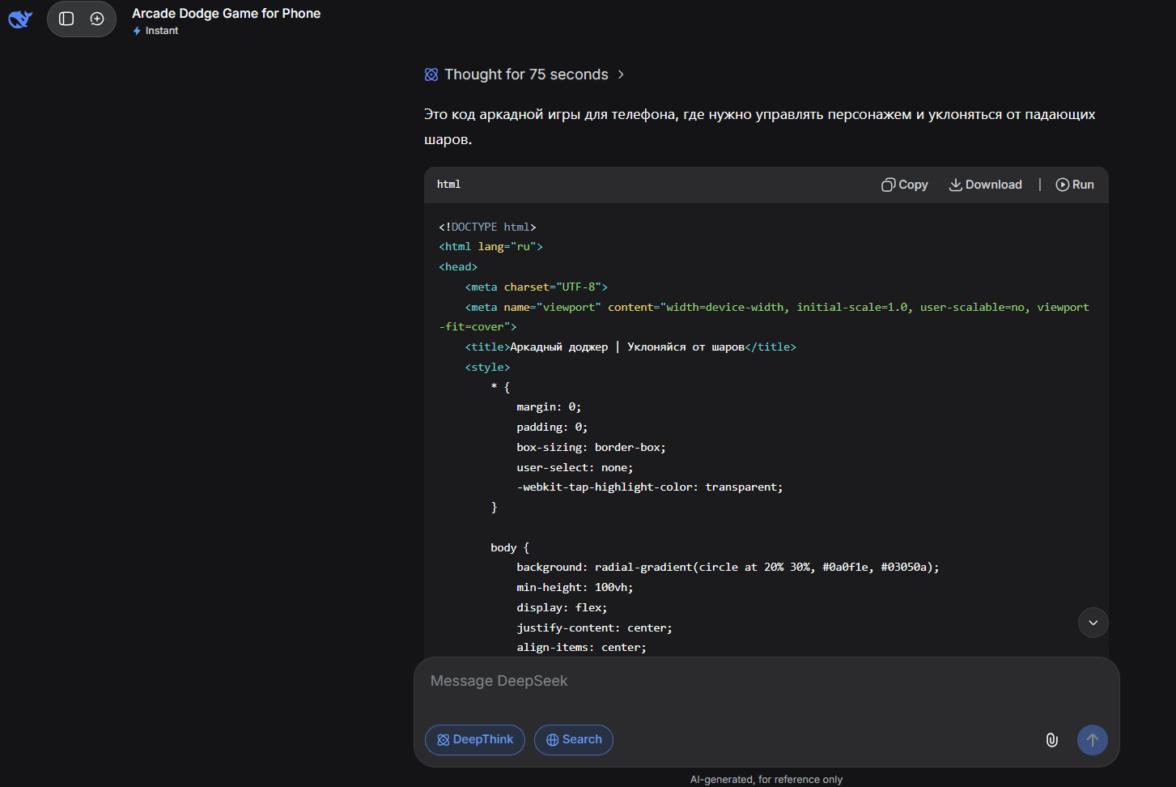 5. Логические задачи, обучение. Специальная версия DeepSeek-R1 обучена «рассуждать». В отличие от обычных моделей, она не просто дает ответ, а показывает пошаговую цепочку рассуждений («сначала я подумал так, потом проверил то…»). Это используют для решения сложных математических задач, бизнес-кейсов, проверки гипотез.