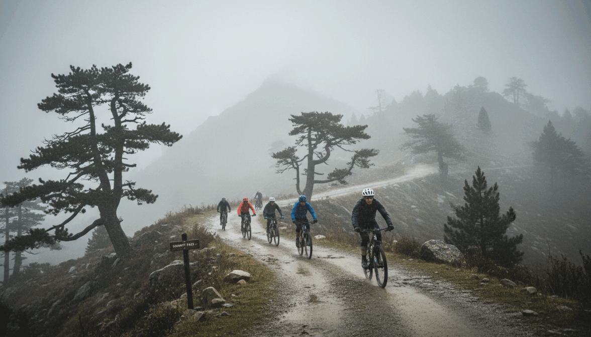 «Сгенерируй видео, где группа людей на велосипедах преодолевает горный перевал в условиях туманного утра, с добавлением эффектов дождя.»