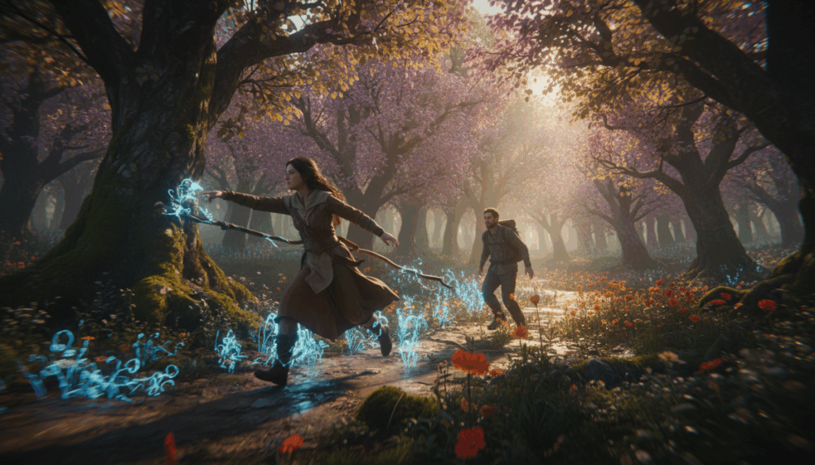 «Сгенерируй реалистичный кадр с движущимися персонажами на лесной дорожке, где природа адаптируется к их движениям, меняя растительность и освещение.»