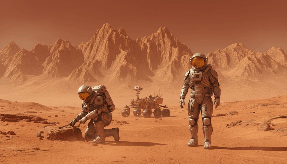 «Покажи космонавтов, исследующих поверхность Марса, с видом на красные горы и пыль, покрывающую землю.»