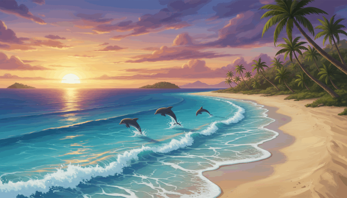 «Сгенерируй красивую анимацию заката на тропическом острове, где в море плещутся дельфины, а волны разбиваются о берег.»