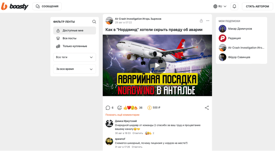 Это не видеохостинг, а площадка для контента, где также доступны видео. Особенность сервиса — доступ к публикациям по подписке, но также есть вариант разовой оплаты или вообще бесплатные тарифы. Изначально Boosty создавался как ресурс для сбора донатов и стал популярным после ухода Patreon.