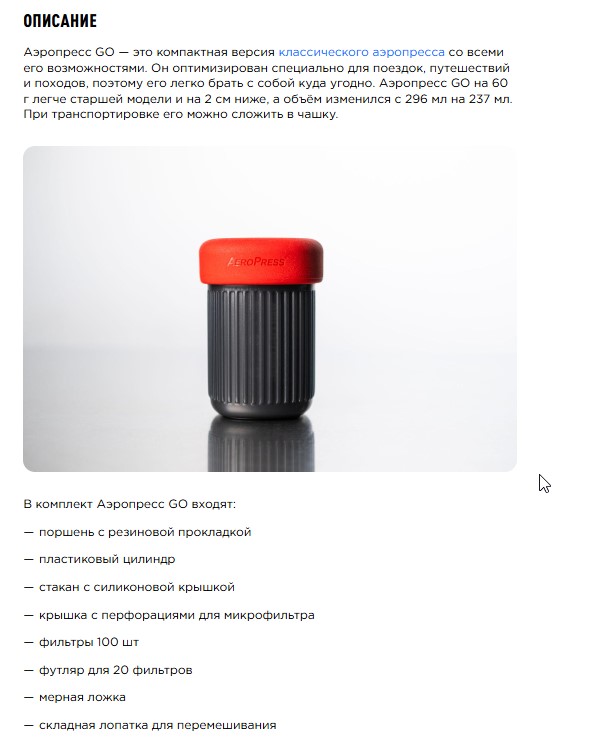 Здесь важно наиболее полно описать товар с разных сторон, но не стоит лепить их в одно полотно, определите структуру — она поможет клиенту не запутаться и найти то, что нужно: