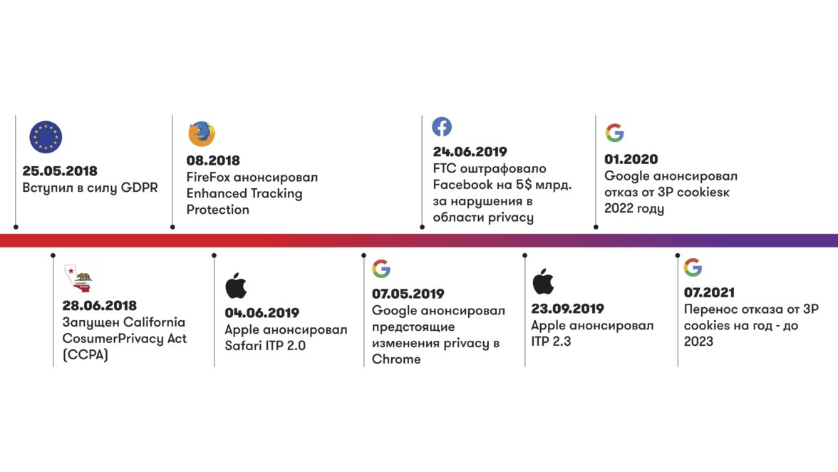 Ряд скандалов, связанных со сбором данных пользователей Facebook, вступление в силу новых регламентирующих законов* и возросший запрос пользователей на анонимность, привели к ужесточению политики вендоров в отношении идентификации пользователей. Apple, Google и Facebook, отвечая новым требованиям приватности, стали методично ограничивать доступ к данным пользователей со стороны. Браузеры постепенно отключают возможность отслеживания 3rd-party cookies, мобильные IDFA и GAID больше недоступны сторонним трекерам.
