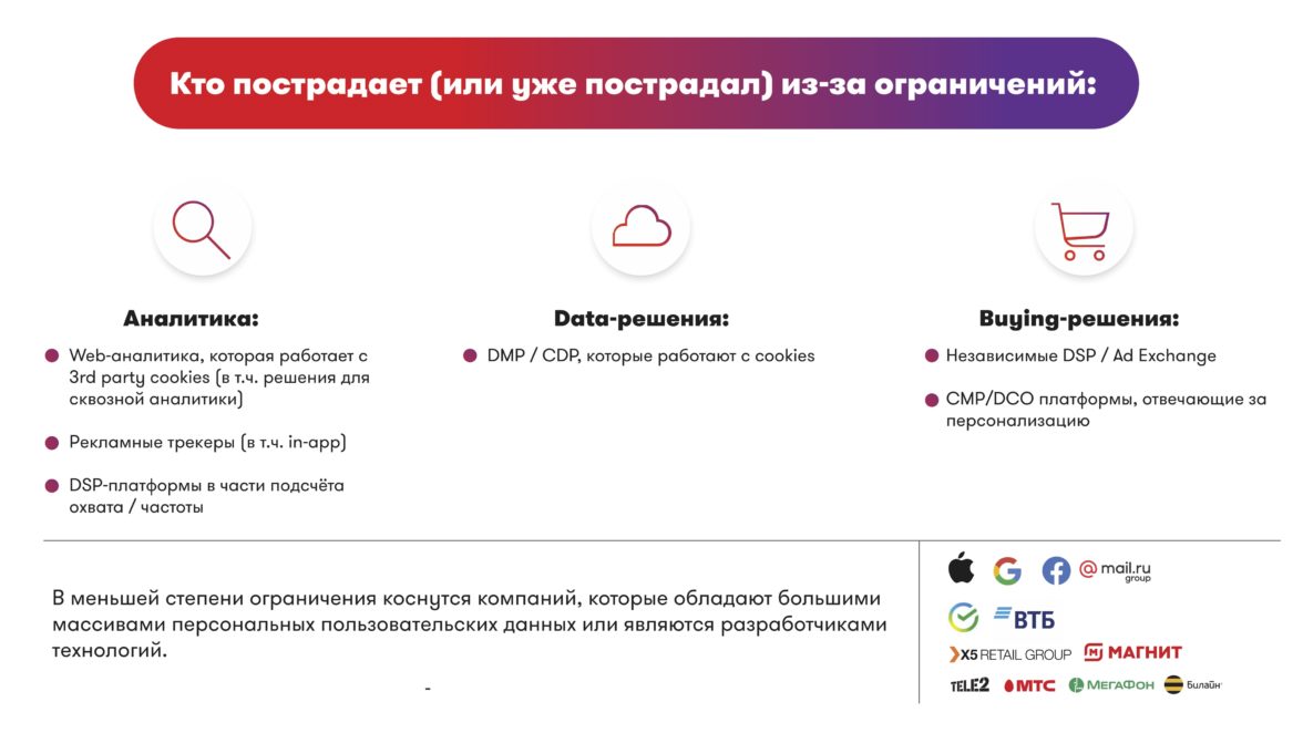 Всё это ведёт к изменению ландшафта рекламного рынка. Любая adtech-компания, у которой нет собственной социальной сети или обширной базы абонентов, становится зависимой от нововведений и рискует если не потерять бизнес, то значительно его трансформировать.