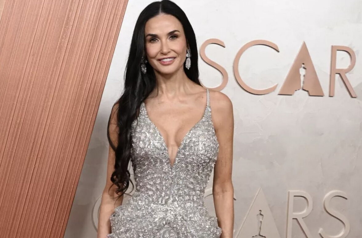 Деми Мур вышла на красную дорожку в платье Giorgio Armani Prive, расшитом кристаллами, с глубоким вырезом и плиссированной отделкой на бедрах, переходящей в драматичный шлейф. Облик дополняли серьги-люстры, кольцо с огромным бриллиантом и завернутый браслет от Chopard.