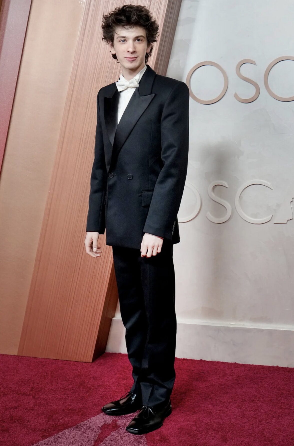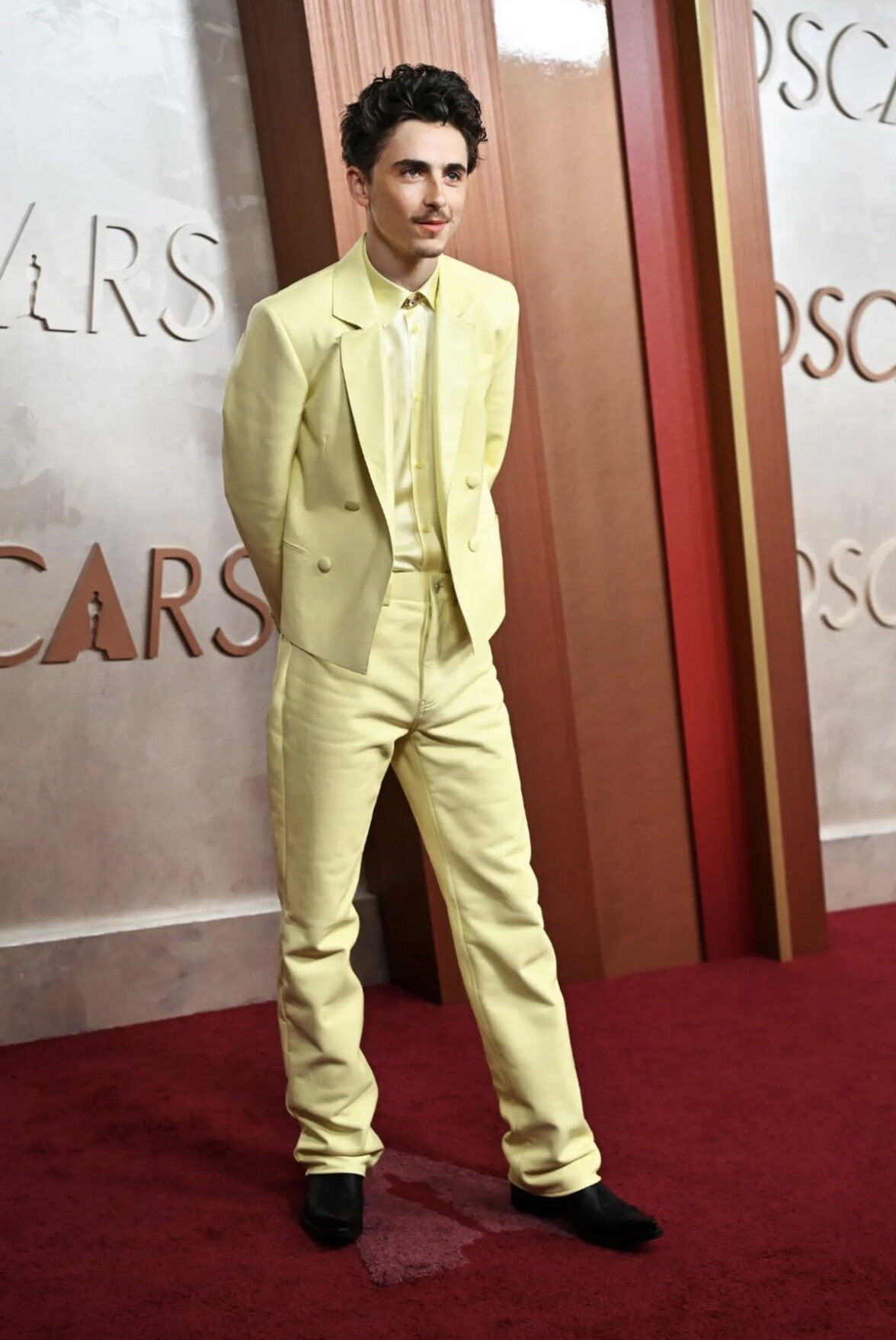 Тимоти Шаламе, не получивший награды за главную роль в фильме «Боб Дилан. Никому не известный», был в в однотонном сливочно-желтом костюме (двубортный пиджак, кожаные брюки, шелковая рубашка) от Givenchy, сшитом по индивидуальному заказу Сарой Бертон.