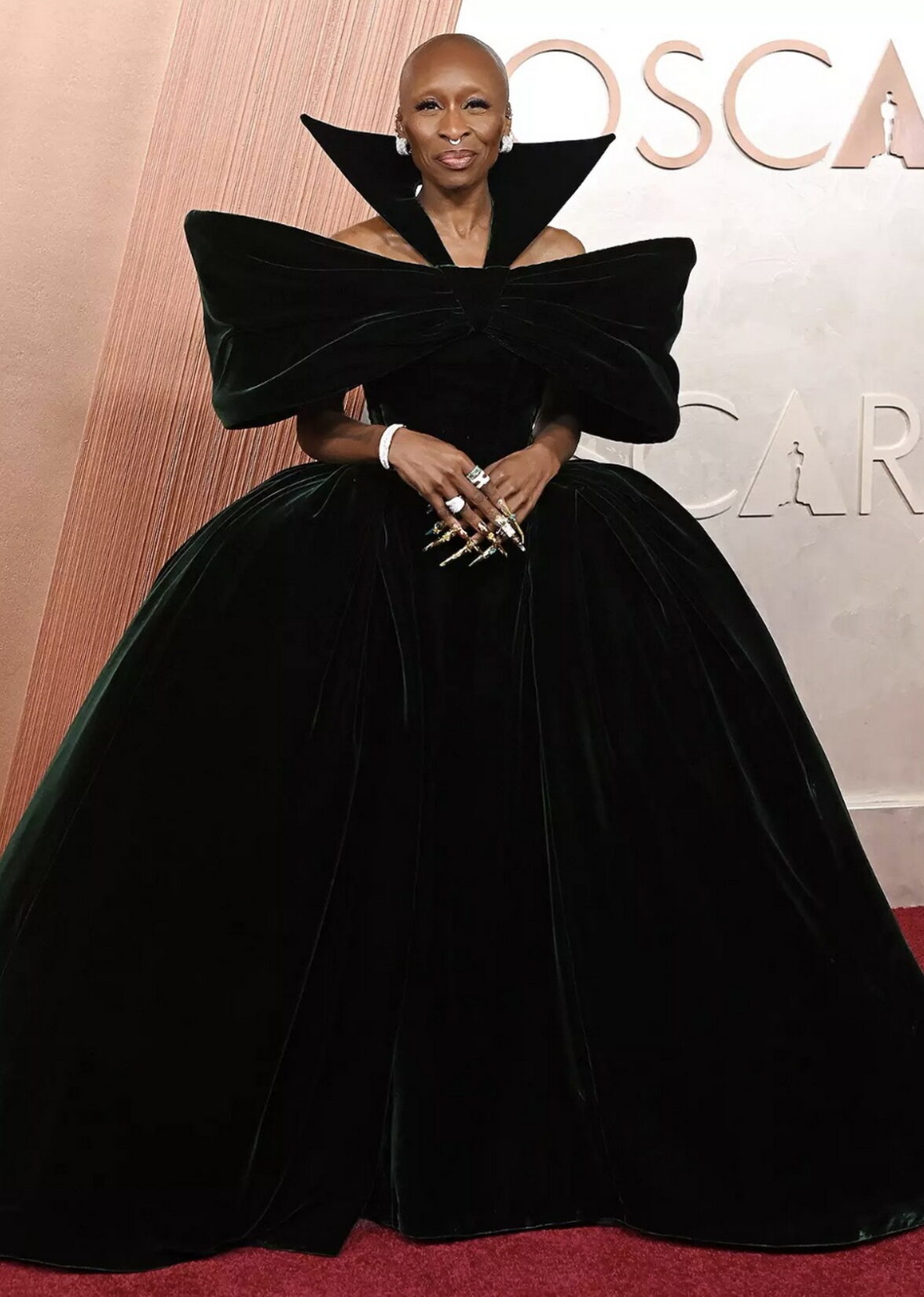 Синтия Эриво (Эльфаба в «Злой») вышла на красную дорожку в бальном платье Louis Vuitton из темно-зеленого бархата с преувеличенными бедрами, плечами и острым воротником. По словам стилиста Джейсона Болдена, этот образ должен был отдавать дань уважения как стране Оз, так и Хэтти Макдэниел, первой афроамериканке, получившей «Оскар» в 1940 году за роль Мамушки в «Унесенных ветром». Над роскошным маникюром Эриво Мика Диор работала несколько часов.