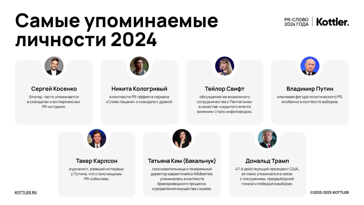 Второе место заняли актеры сериала «Слово пацана», в частности Никита Кологривый, сумевшие превратить популярность проекта в мощный коммерческий инструмент. На третьем месте — Тейлор Свифт, оказавшаяся в центре международного обсуждения после слухов о ее возможном сотрудничестве с Пентагоном в качестве «скрытого агента влияния».
