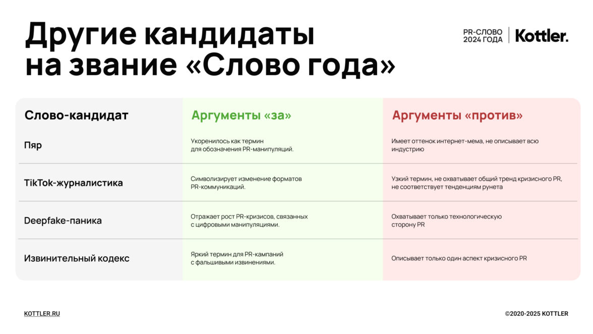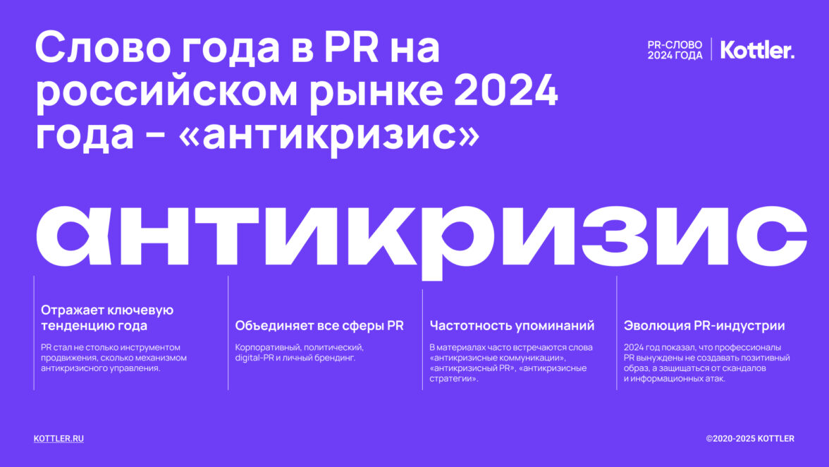 Согласно исследованию коммуникационного агентства Kottler, главным термином в PR-индустрии 2024 года стал «антикризис» — он доминировал в профессиональном дискурсе и медиа. На втором месте оказалась «антикризисная коммуникация», а на третьем — «извинительный кодекс». Антикризисная поддержка — ключевая компетенция PR-специалистов.