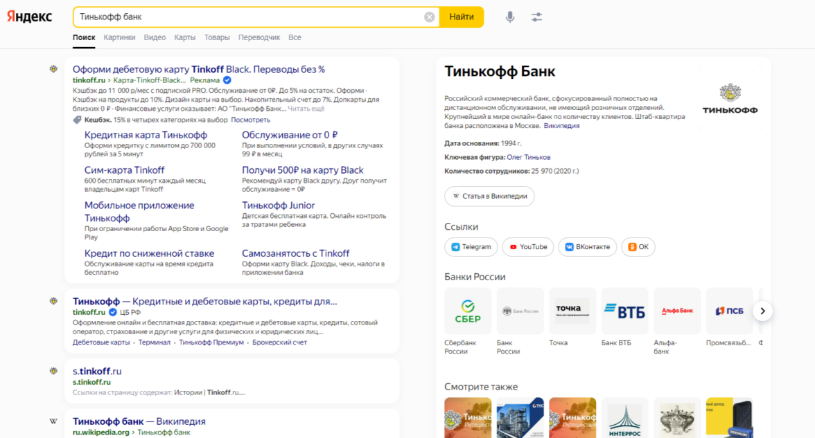 Мы выбрали последний вариант и карточка компании теперь визуально занимает половину первой страницы выдачи обеих поисковых систем и показывает официальные источники информации нашего заказчика.