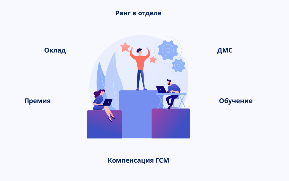 Мы выяснили, что одним из элементов системы мотивации персонала является градация. Второй элемент системы — частичная или полная компенсация расходов сотрудников за счет компании на ГСМ, транспорт, дополнительное обучение (сверх того, что дается в компании) и ДМС. Третий элемент — оклад.