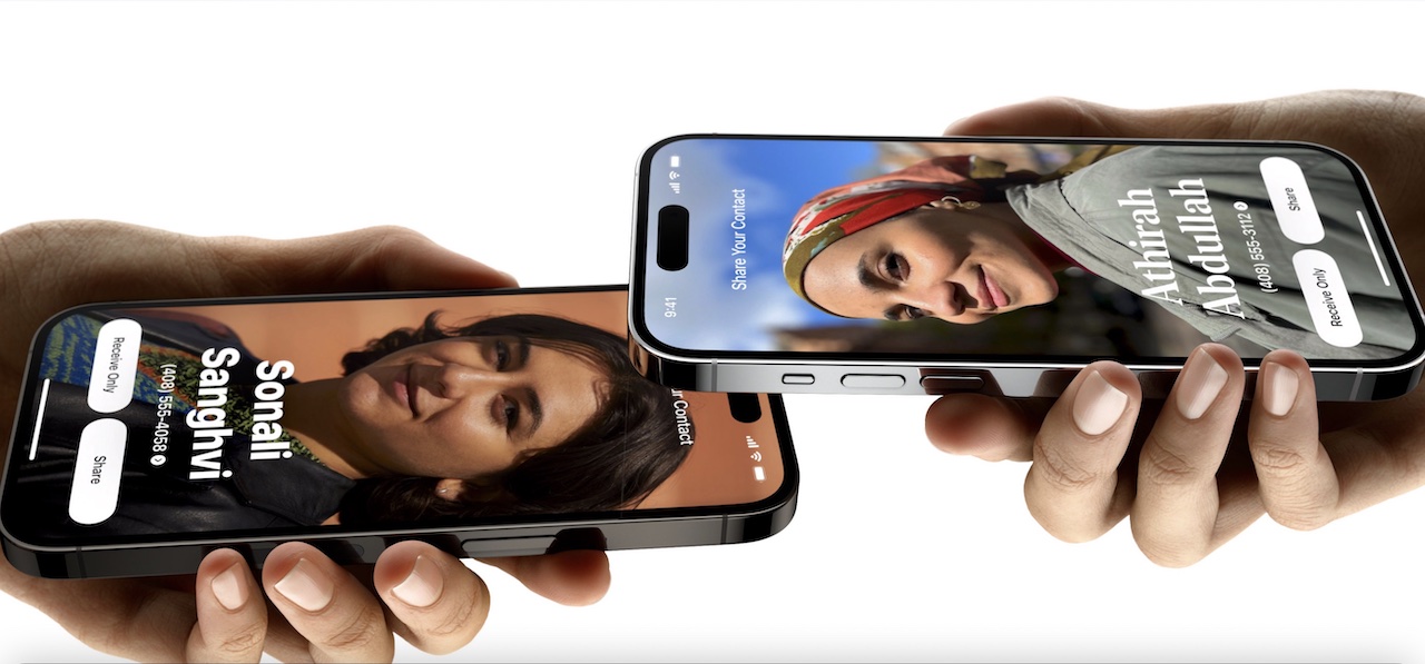 - NameDrop — новая функция AirDrop, позволяющая обмениваться контактной информацией (и постерами), просто соединив свои устройства iPhone. Таким же жестом можно будет обмениваться контентом или запускать SharePlay, чтобы слушать музыку, смотреть фильмы или играть в игры, находясь в непосредственной близости