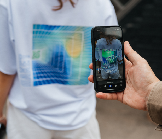 Разобрав вместе с клиентом айдентику сервиса и корпоративные ценности, мы остановились на слогане «старые ключи не открывают новые двери». В дизайне решили работать с эстетикой оптических иллюзий. Все вместе это работает так: пользователь наводит камеру на принт, размещенный на футболке. Камера считывает интегрированный в принт QR-код, пользователь переходит по ссылке, где открывается камера телефона и он видит «привязанный» к метке-принту эффект в дополненной реальности.