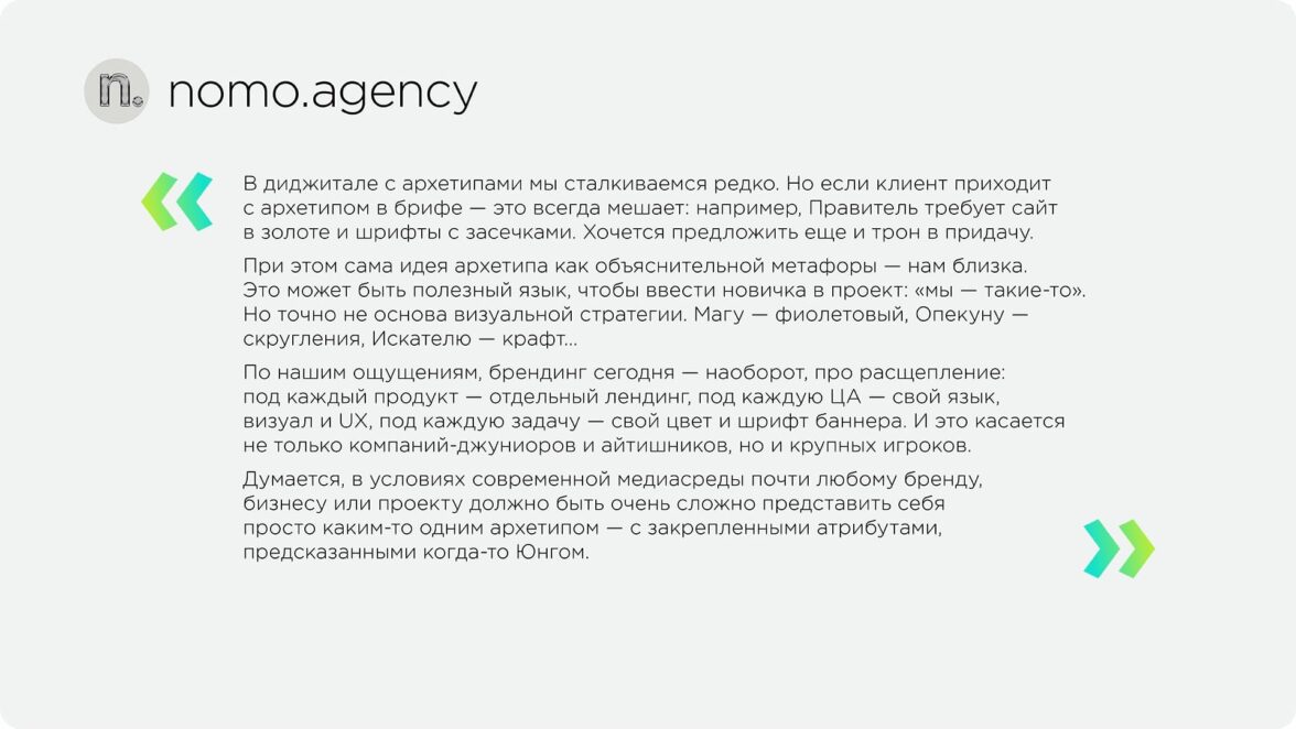 Резюмируем. У архетипов есть право быть одной из многих красок в палитре бренд-стратега. Они могут помочь сгенерировать идеи или найти метафору. Но не должны становиться отправной точкой или основой стратегии.