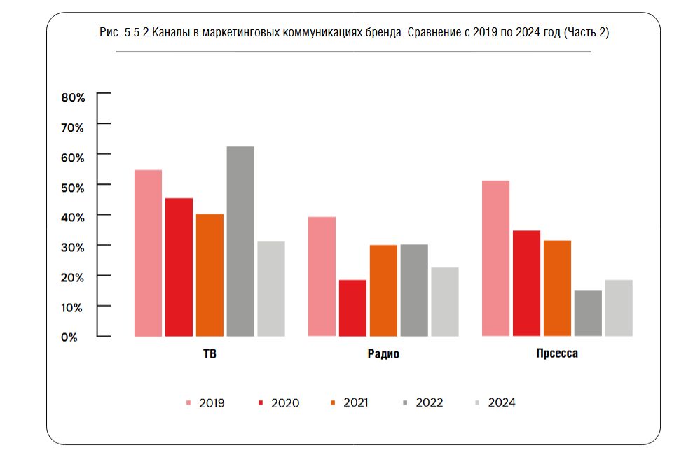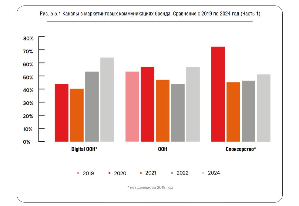Помимо онлайн-рекламы, заметно усилили позиции спонсорство (51%) и цифровая реклама вне дома (61%). По результатам опроса понизилась востребованность ТВ-рекламы — до 30% после всплеска в 2022 году и радио — до 23%. Реклама в прессе стала немного популярнее (19% в 2024 году к 14% в 2022 году). Использование наружной рекламы после постепенного спада, начавшегося с 2020 года, вернулось к допандемийному показателю (56%).