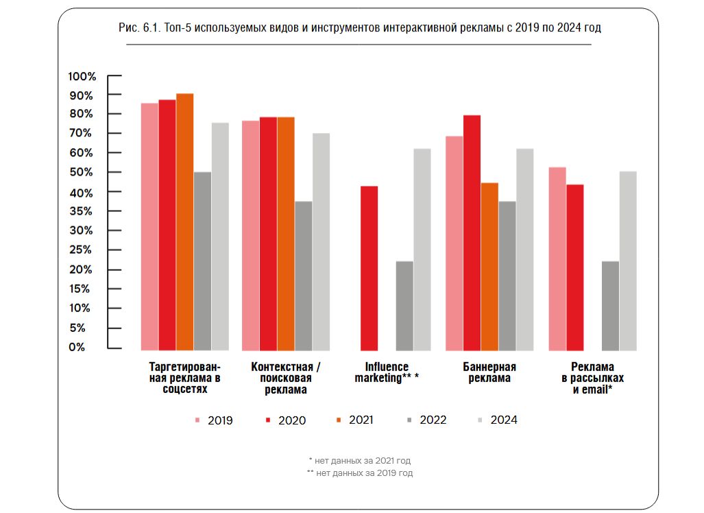Среди самых используемых форматов интернет-рекламы респонденты выделили таргетированную рекламу, которая вернула лидирующие позиции, достигнув 75% использования, хотя и не догнала докризисный уровень 2021 года. Баннерная реклама усилила позиции, показав 61% против 54% в 2021 году. Наиболее значительный рост продемонстрировал инфлюенс-маркетинг, став основным брендинговым инструментом с показателем 57%.