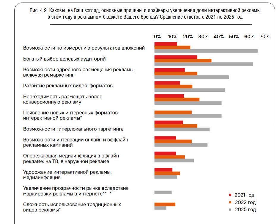 Основными драйверами роста бюджетов на интерактивную рекламу рекламодатели назвали факторы, связанные с возможностями таргетинга: большой выбор целевых аудиторий (62%) и возможность адресного размещения рекламы (49%). При этом значимость гиперлокального таргетинга упала с третьей на седьмую позицию с 2022 года. Помимо настройки рекламы рекламодатели стали больше ценить возможность измерения результатов вложений в рекламу. Этот фактор возглавил рейтинг в 2025 году с 66% голосов. Почти половина респондентов (45%) считают интерактивную рекламу более эффективной и конверсионной, а 47% рассматривают видеоформат рекламы как наиболее актуальный.