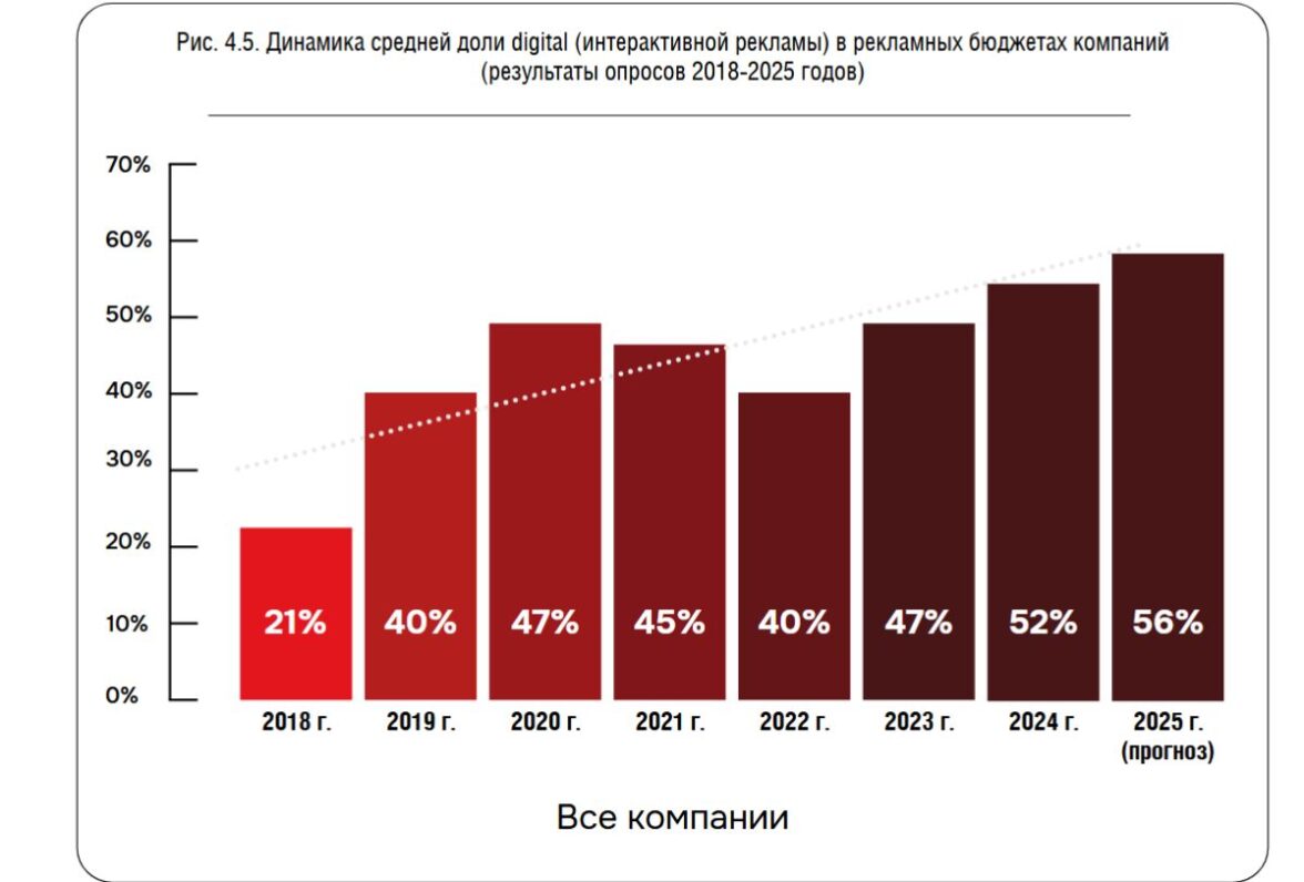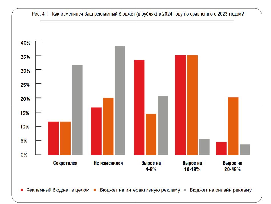 Об увеличении бюджета на интернет-рекламу в 2025 году на 4-20% заявили 61% участников опроса. Основными причинами роста доля интерактивной рекламы респонденты назвали общее увеличение маркетинговых бюджетов и перераспределение бюджетов из офлайн-медиаканалов. 57% опрошенных заявили, что их общий рекламный бюджет по всем каналам коммуникации вырос лишь на 4-10%. Расходы на офлайн-рекламу сохранили или уменьшили 79% респондентов АРИР. О сокращении бюджета на интерактивную рекламу сообщили 9% опрошенных.