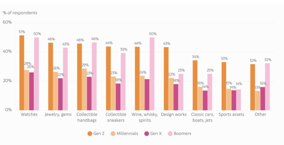 Как зависит от поколений интерес к коллекционированию предметов, не относящихся к произведениям искусства. Виды коллекций (слева направо): часы; ювелирные украшения и драгоценные камни; сумочки; кроссовки; вино, виски и другое спиртное; предметы дизайна; классические автомобили, яхты, самолеты; спортивные активы; другое. Поколения (слева направо): зумеры, миллениалы, поколение Х, бумеры.