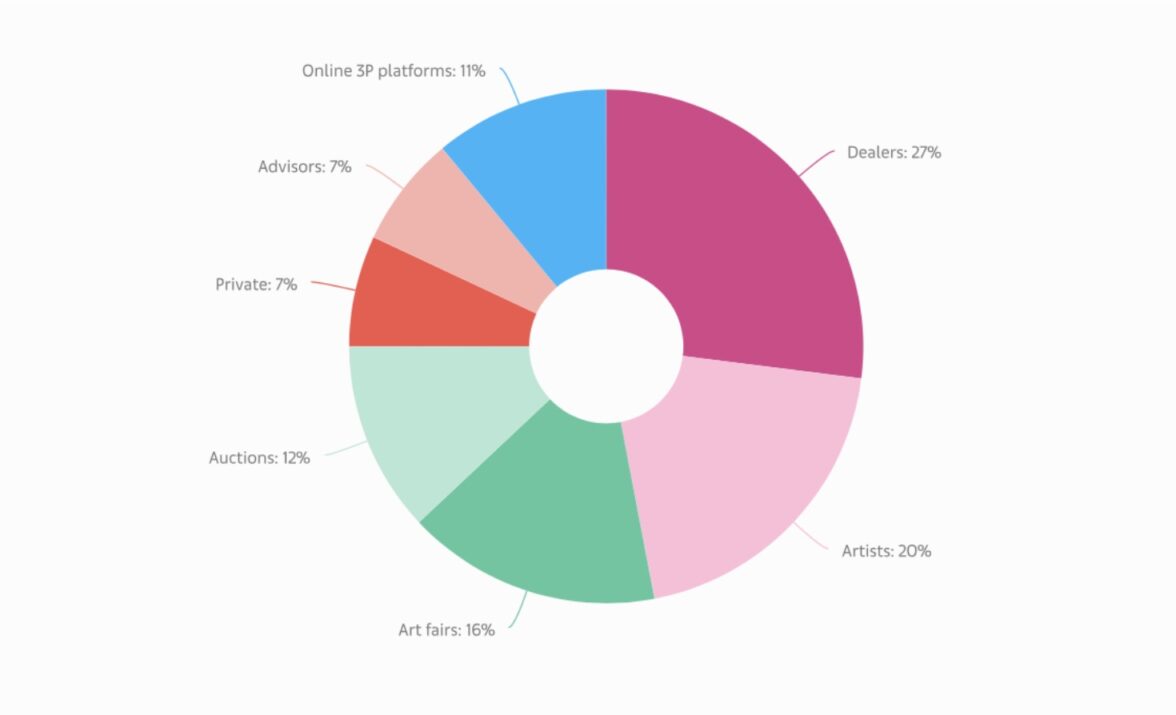 43% от общего объема сделок с произведениями искусства, совершенных состоятельными людьми в 2024 году пришлось на дилеров (напрямую или на арт-ярмарках). Это меньше, чем годом раньше, когда аналогичный показатель составлял 60%. В первой половине 2025 года на долю дилеров пришлось 45% покупок (30% напрямую, 15% — на арт-ярмарках).