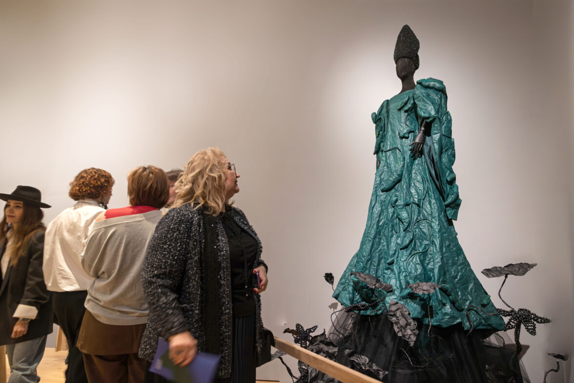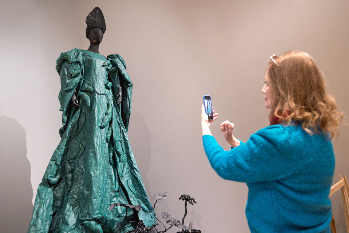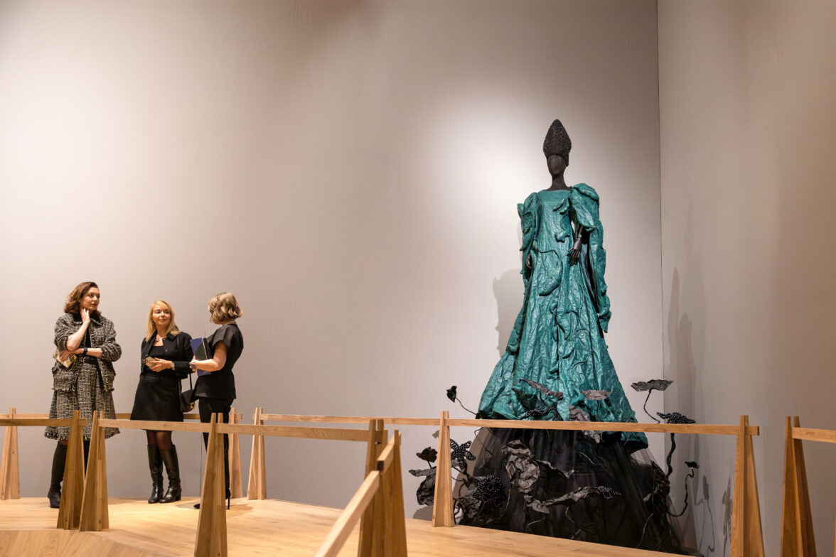 Совместный проект двух российских брендов стал признанием в любви своей стране, ее культуре и природе. Вдохновением для образа послужили национальные художественные традиции и природные мотивы. Платье с символичным названием «Волшебный лес» таежного цвета отсылает к образу русского народного костюма с длинными пышными рукавами и тонким силуэтом. Все швы выполнены в органичной, биоморфной эстетике — без прямых линий, словно повторяя пластику растительных форм. Платье украшено объемными 3D-листьями, выполненными в кутюрной ручной технике. На создание ушло 12 метров ткани из переработанного пластика и 120 часов работы закройщиков, швей и вышивальщиц.