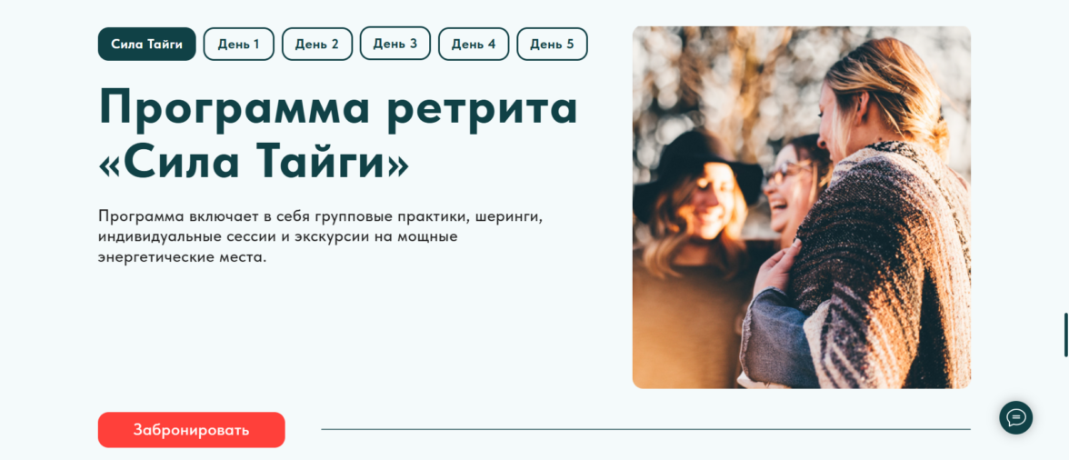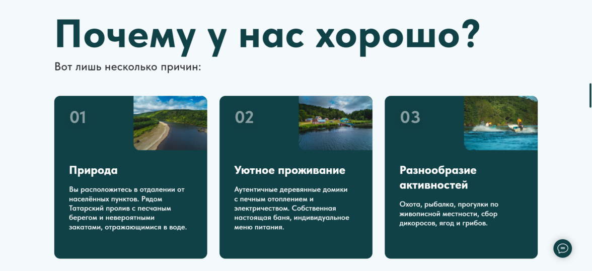 Важные вопросы вынесены на передний план — мы разместили ключевые ответы сразу после вводного блока в мобильной версии и третьим по счету в версии для ПК. Так посетитель сразу понимает, подходит ли ему предложение, без необходимости листать в конец страницы. К тому же, важным нюансом выступает расположение базы глубоко в лесу, добраться туда непросто, и пользователь должен узнать об этом в первую очередь.