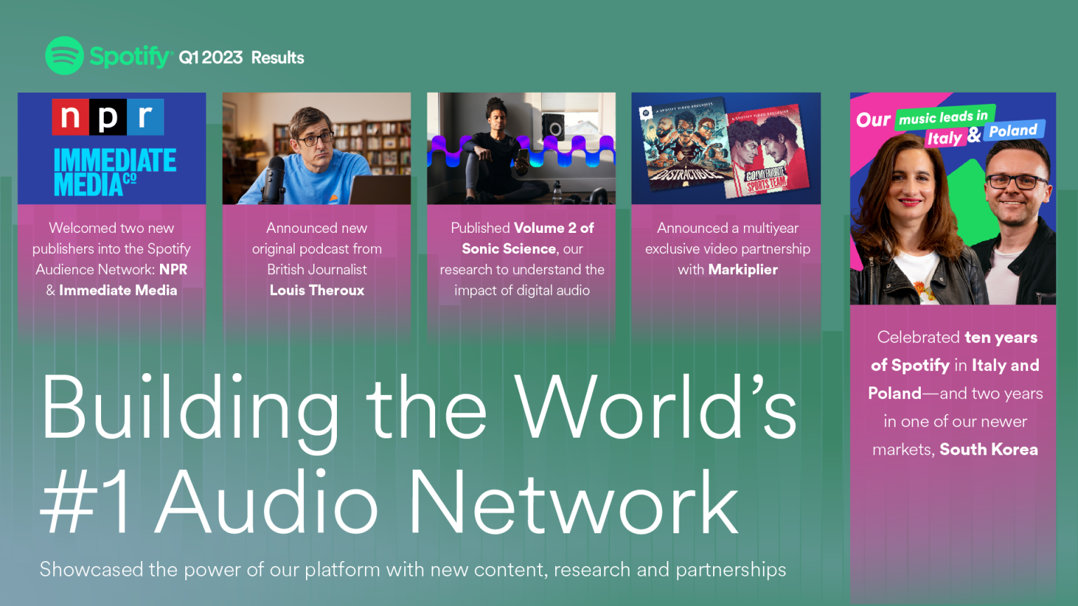 Spotify сообщает, что по состоянию на 31 марта 2023 года более полумиллиарда человек, а точнее 515 млн, ежемесячно пользуются его потоковым аудиосервисом. Это на 22% больше, чем в прошлом году, или на 5% больше, чем в четвертом квартале 2022 года. Spotify заявил, что рост пользователей превысил прогноз на 15 млн. База платных подписчиков сервиса теперь составляют 210 млн человек, что на 15% больше, чем в конце прошлого года. Выручка платформы составила €3 млрд (+14% год к году).