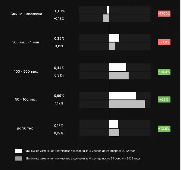 Крупные сообщества, имеющие более 500 тыс. подписчиков, напротив, столкнулись с существенным замедлением темпов роста аудитории и увеличением количества отписок. Сложнее всего сообществам-миллионникам. Еще до 24 февраля такие страницы теряли существующую аудиторию быстрее, чем набирали новую. Весной эта тенденция усилилась, говорится в отчете. Темпы оттока подписчиков в этой группе увеличились в 18 раз. Сообщества, насчитывающие от 500 тыс. до 1 млн участников, продолжают наращивать аудиторию, но темпы роста по сравнению с осенью и зимой снизились более, чем в полтора раза.
