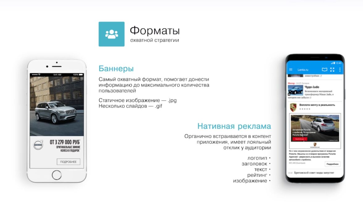 Многообразие рекламных форматов. В мобайле автобренды могут размещать разные креативы: fullscreen и нативные баннеры, видео, Rich Media и другие.