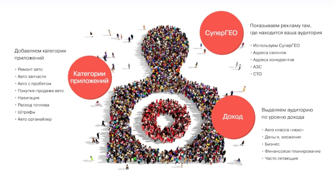 Целевую аудиторию авто нам помогают найти широкие возможности таргетингов платформы BYYD.