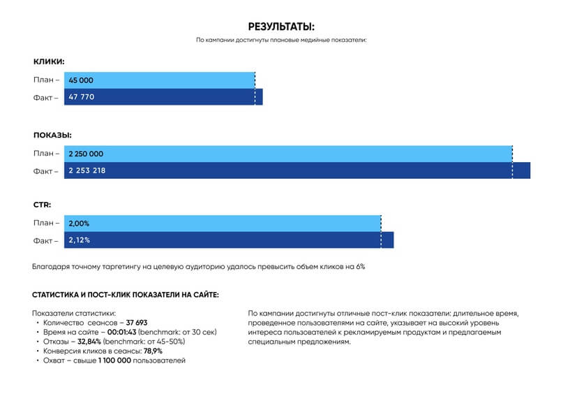 Правильно выбранные таргетинги, динамичные креативы и качественная оптимизация позволили выйти на CTR — 2,12%. А также превысить объем по кликам на 6% и охватить более 1 млн пользователей