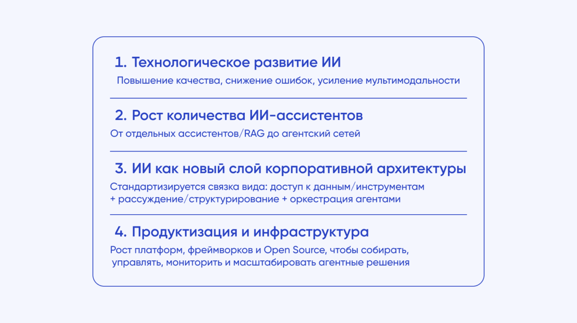 ИИ стремительно выходит за пределы отдельных функций и пронизывает корпоративные системы. То, что сегодня выглядит как набор инструментов — ассистенты, RAG-решения, схемы обработки данных — в ближайшие годы станет основой для полноценной агентной экосистемы.