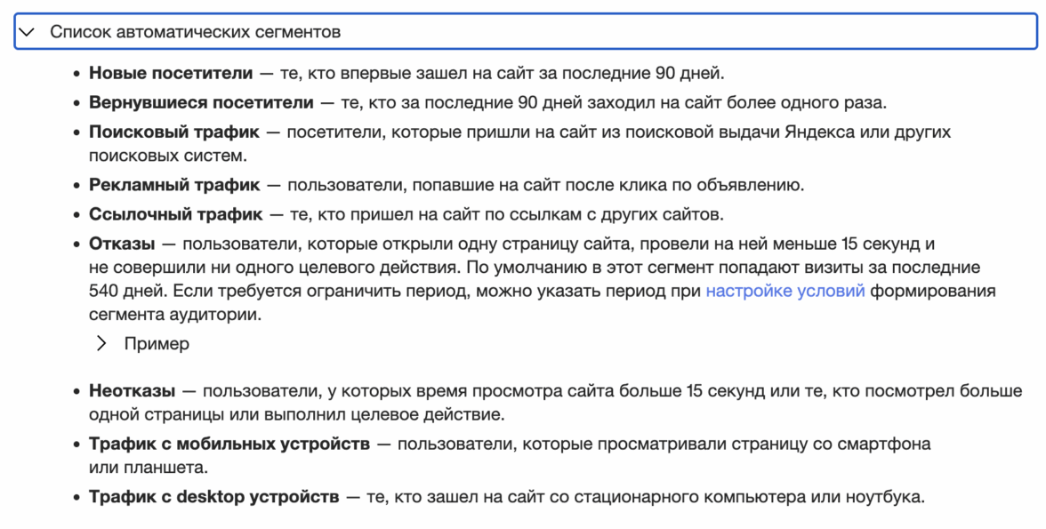 В Яндекс Директе доступны автоматические сегменты, если не сохранились пользовательские сегменты в Метрике. Сегментация возможна по множеству критериев: новые или возвращающиеся пользователи, источник трафика, тип устройства, отказы и пр.