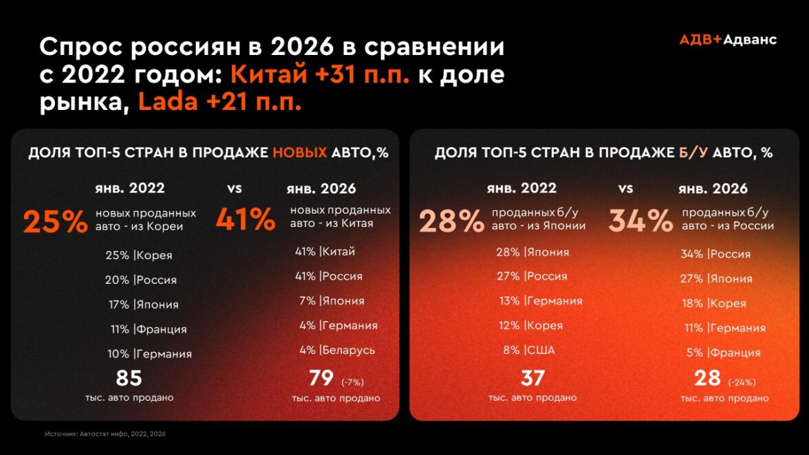 На этом фоне происходит ключевой структурный сдвиг — усиление китайских брендов. Уже сегодня они формируют около половины продаж новых автомобилей, а с учетом Lada — до 80% рынка (источник: Автостат). С 2022 по 2026 год доля китайских производителей увеличилась на 31 п.п.