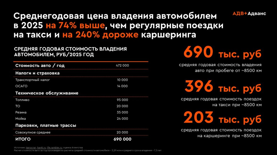 Дополнительно меняется экономика владения. Среднегодовые расходы на автомобиль — около 690 тыс. рублей против 396 тыс. на такси и 203 тыс. на каршеринг (источник: Автостат, banki.ru, life.rambler.ru, оценка Адванс). Это не приводит к отказу от личного транспорта, но усиливает требование к обоснованию покупки. Решение становится более взвешенным, цикл — длиннее.