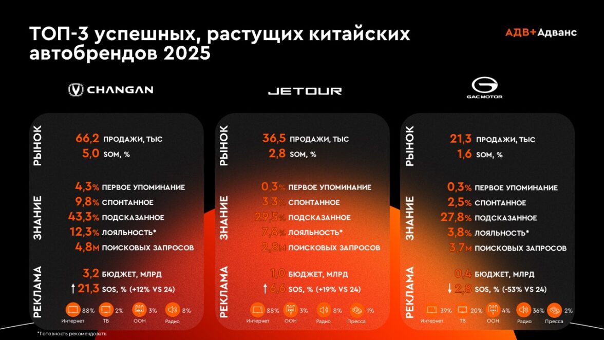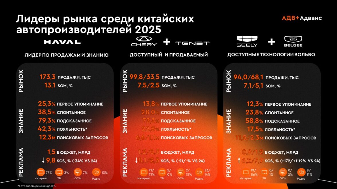 Таким образом, китайские автомобильные бренды закрепили свою роль ключевых игроков на российском рынке. Следующий этап развития категории будет связан не столько с количественным ростом, сколько с углублением конкуренции, развитием позиционирования и повышением эффективности работы с аудиторией.