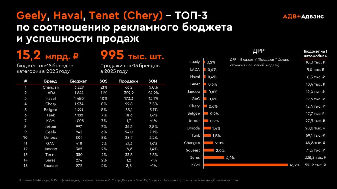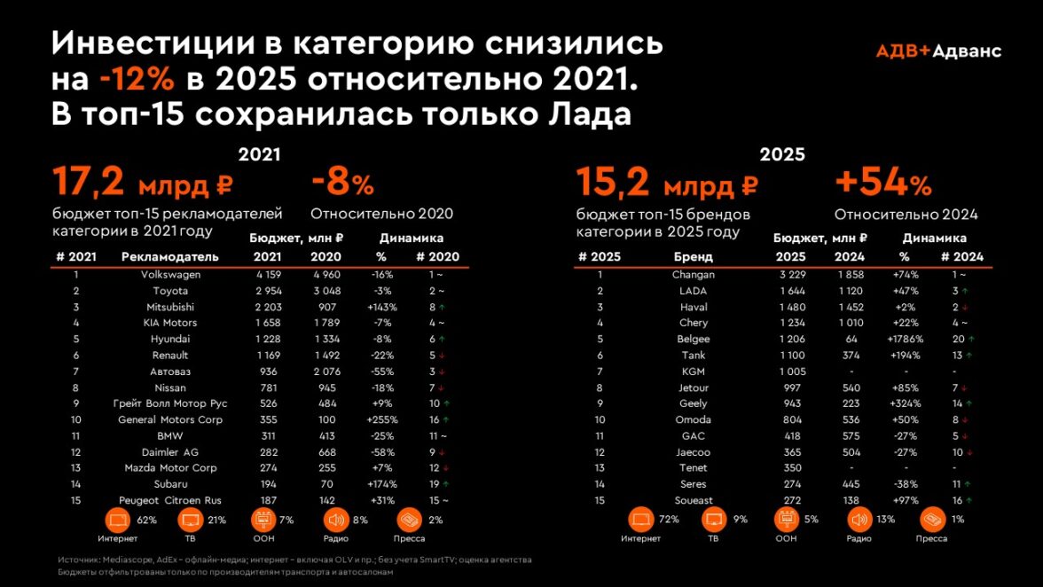 Отдельно стоит отметить изменения в медиастратегиях. Рекламные инвестиции в категории остаются значительными — около 15,2 млрд рублей у топ-15 брендов при объеме продаж 995 тыс. автомобилей (источник: Mediascope, AdEx, оценка Адванс). При этом до 70–90% бюджетов сосредоточено в digital-каналах.